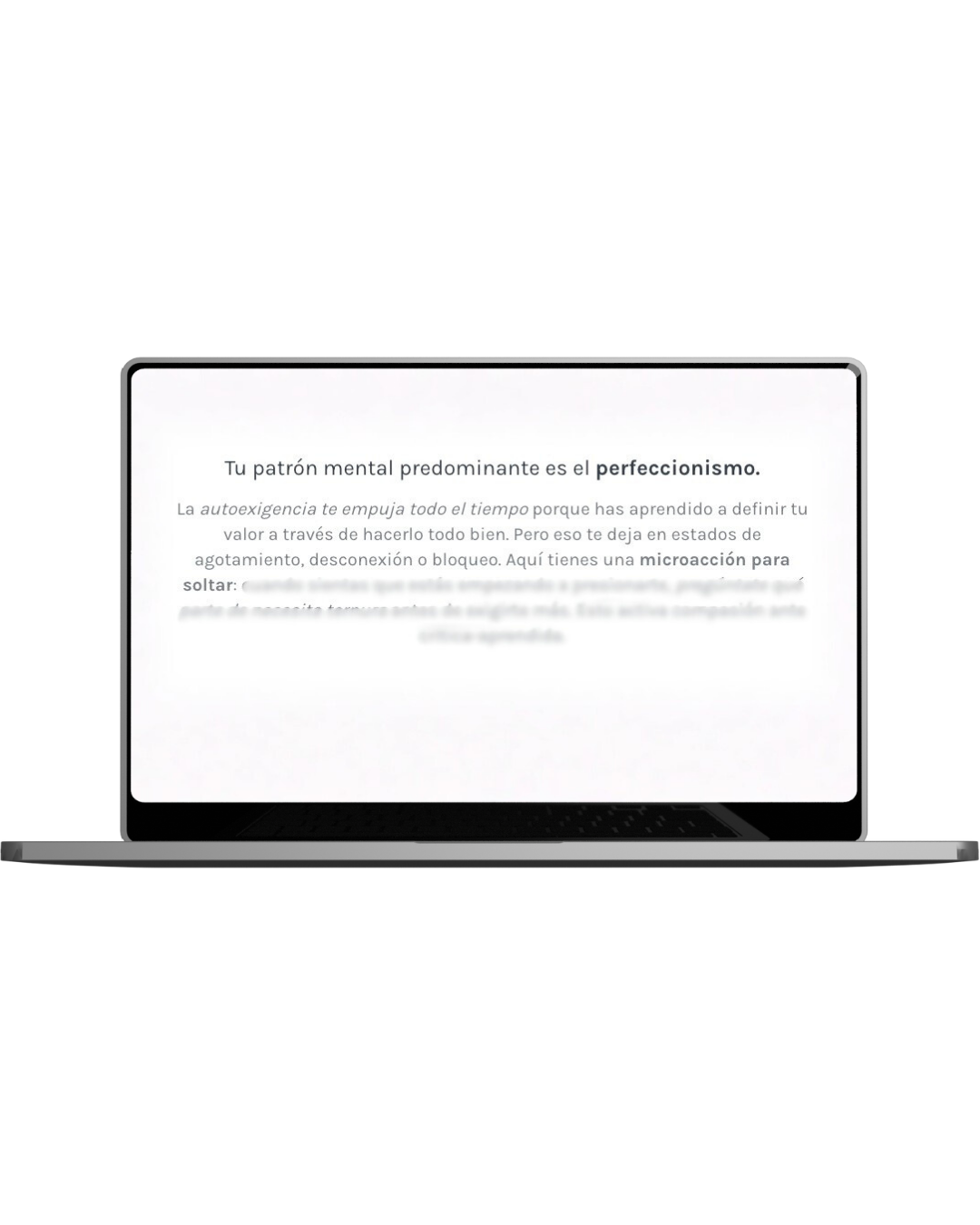 Una vez tienes claridad sobre "mi patrón que dirige mi sistema nervioso es X" puedes aplicar el remedio para cuando vuelva lo antiguo que te deja empequeñecida, porque igual en lugar de exponerte y sobresalir en lo tuyo, te quedas en segundo plano callada y dudando de ti. Este test te ofrece acciones inmediatas que puedes tomar basadas en neurociencia para que después puedas aplicar todo el sistema que te voy a enseñar y avanzar de verdad.