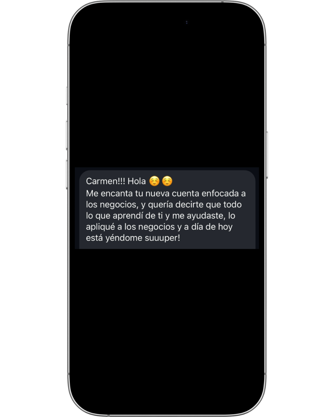 Acceso constante a compartir y corregir avances y decisiones que tomar con feedback de Carmen 2 veces por semana. Es un espacio grupal con mujeres altamente comprometidas donde hay feedback entre compañeras.